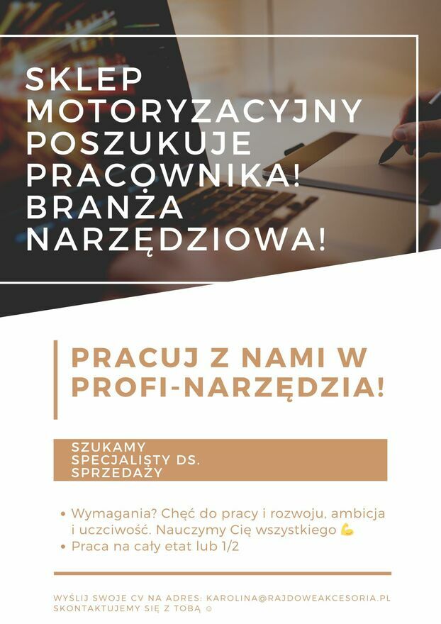 PRACA SZUKA CZŁOWIEKA Specjalista ds. sprzedaży w sklepie narzędziowym POSZUKIWANY! Węgrzce koło Krakowa.Jeśli interesujesz się branżą motoryzacyjną i chciałabyś/chciałbyś pracować z fajnymi ludźmi - zgłoś się do nas i dołącz do naszego zespołu.